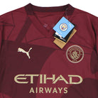 Manchester City’s 2024/25 third kit reimagines the club’s classic burgundy colourway with metallic gold trims, symbolizing the club's continuous evolution and forward momentum. The design features an all-over tonal graphic inspired by the ship from the Manchester City crest, representing the club's rich history and dynamic legacy.