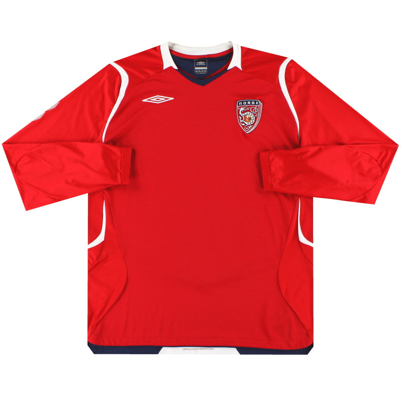 Home shirt as worn in Norway's ultimately unsuccessful World Cup 2010 qualification campaign. They finished 2nd in their group behind qualifiers Netherlands and were in contention for a play-off spot but their record was the worst of all the runners-up and were therefore eliminated