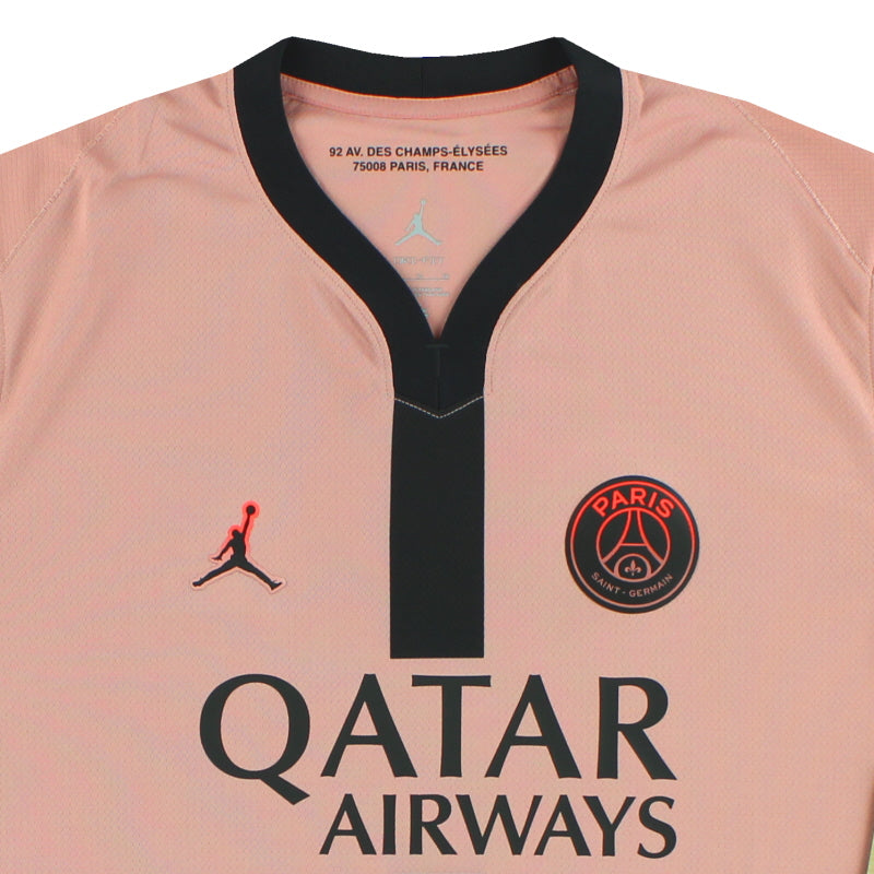 The shirt features a rust-pink base accented by a bold black vertical stripe running down the centre, a modern reinterpretation of PSG’s classic Hechter design. Its gradient, colour-shifting logos symbolise the unity of the men’s and women’s teams, reflecting the collection’s empowering theme, “Together We Rise".