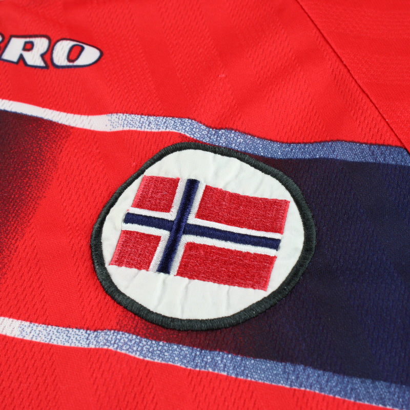 Details - Home shirt as worn during qualification for the 1998 World Cup when Norway successfully qualified for the competition, finishing top of their qualification group ahead of Hungary.