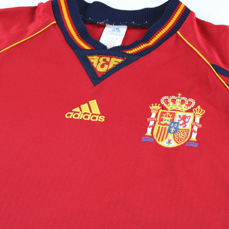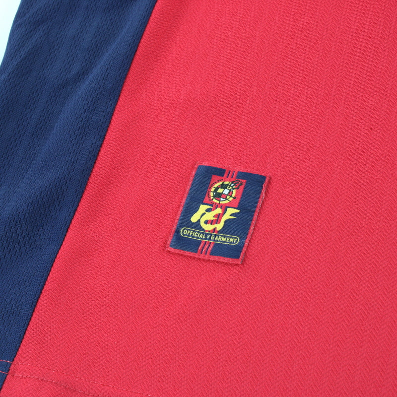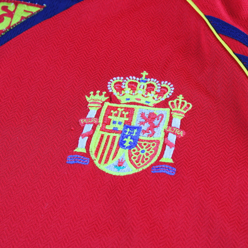 Details - Home shirt as worn when Spain competed in the 1998 World Cup, failing to advance from the group stages after finishing 3rd in their group behind Nigeria and Paraguay, finishing with 4 points after drawing 0-0 with Paraguay and beating Bulgaria 6-1. However, that was not enough to make it to the knockout stages after losing 3-2 against Nigeria in their opening game.