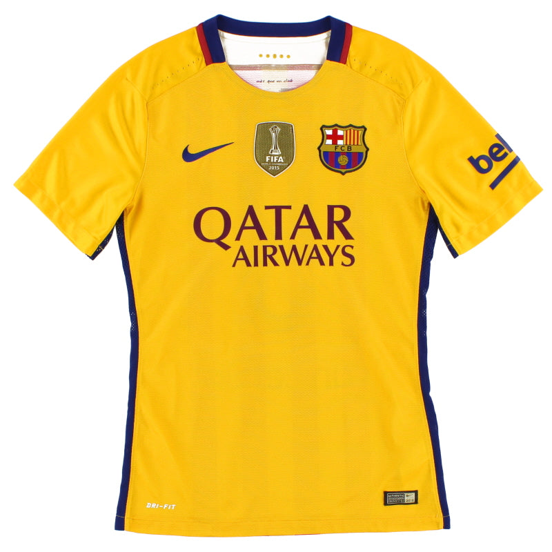 Details - Away shirt as worn when Barcelona finished as champions of La Liga, finishing 1 point ahead of second placed Real Madrid, and also won the Copa del Rey after beating Sevilla 2-0 in the final with Jordi Alba and Neymar scoring the goals for Barcelona in extra time. Also worn when Barcelona were knocked out in the quarter finals of the Champions League, losing 3-2 on aggregate against Atletico Madrid.