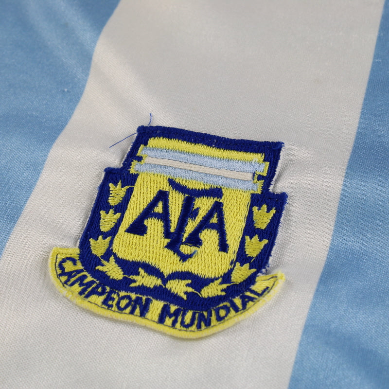 Details - Home shirt as worn when Argentina were competing in the 1986 World Cup when the team won the competition for the second time in it's history, beating West Germany 3-2 in the final after a winning goal in the 86th minute by Jorge Burruchaga.