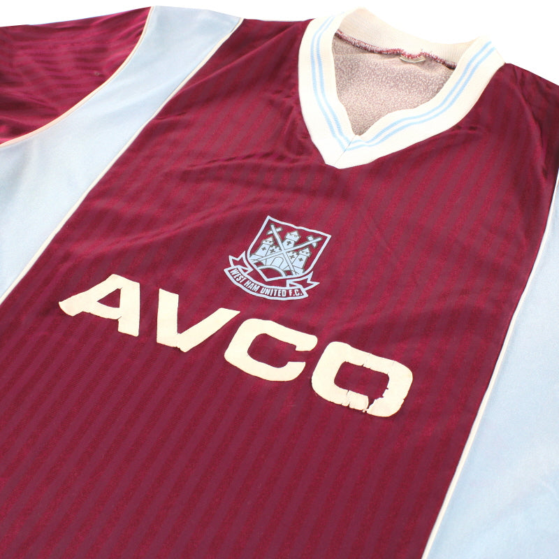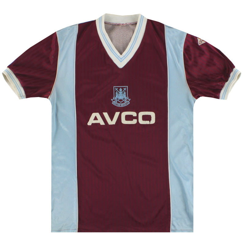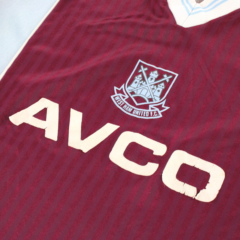 Details - Home shirt as worn when West Ham just avoided relegation from the First Division in the 1987-88 season, finishing in 16th place, before finishing 19th in the next season were relegated to the second tier of English football with manager John Lyall being sacked after 15 years in charge.