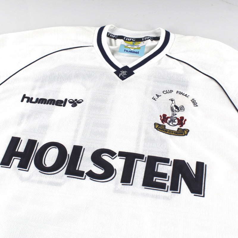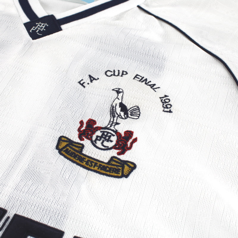 Details - Home shirt that was due to be worn by Tottenham Hotspur in the 1991 FA Cup Final, however, due to a change in kit manufacturers with Hummel losing their contract with the club just prior to the final, the team instead wore their new Umbro shirt that was worn between the 1991-93 seasons. The game itself saw Tottenham become FA Cup winners for a then record eighth time after beating Nottingham Forest 2-1 after extra time in the final thanks to goals from Paul Stewart and an own goal by Des Walker in extra time. The game was also Paul Gascoigne's last game for the club after he was stretchered off in the 15th minute, recovering for the entirety of the 1991-92 season before leaving the club to join Lazio.