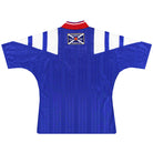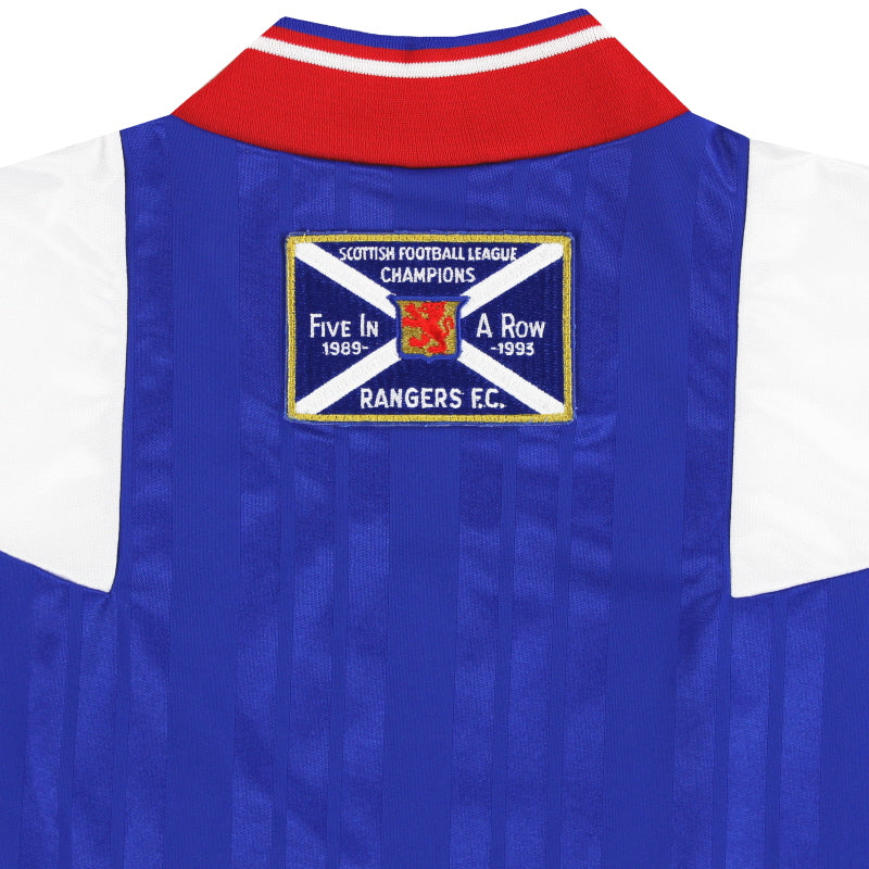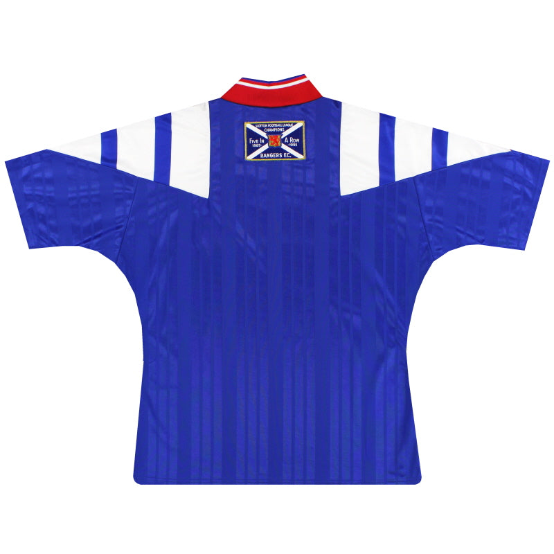 Details - Home shirt as worn when Rangers finished as champions of the Scottish Premier Division in back to back seasons and also won the Scottish League Cup in back to back seasons, beating Aberdeen in respective seasons. Also worn when Rangers won the 1992-93 Scottish Cup final, beating Aberdeen 2-1 in the final, and were knocked out in the group stages of the 1992-93 European Cup, finishing as runners up in their group, 1 point behind group winners Marseille and a place in the European Cup final.