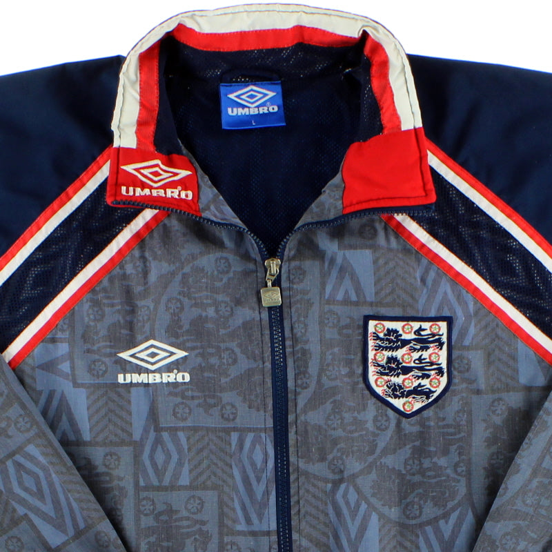 Details - Track jacket as worn in England's dismal 1994 World Cup qualifying campaign where they failed to qualify for 1994 World Cup, finishing 3rd in their group behind Norway and the Netherlands.