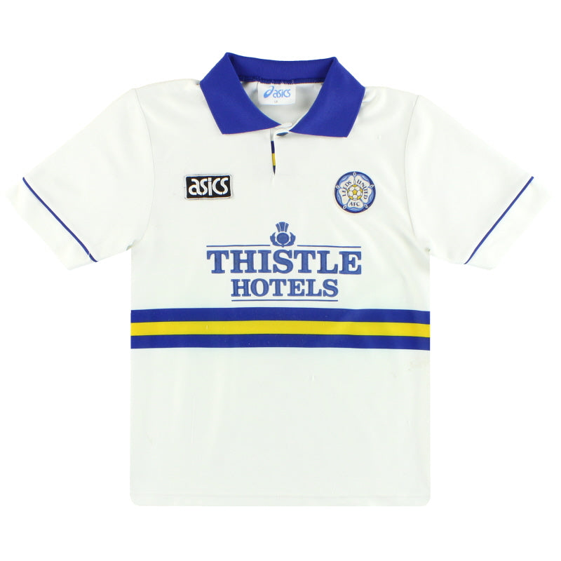 Details - Home shirt as worn when Leeds United finished 5th in the Premier League in consecutive seasons under Howard Wilkinson and were knocked out in the fifth round of the 1994-95 FA Cup, losing 3-1 against Manchester United.