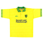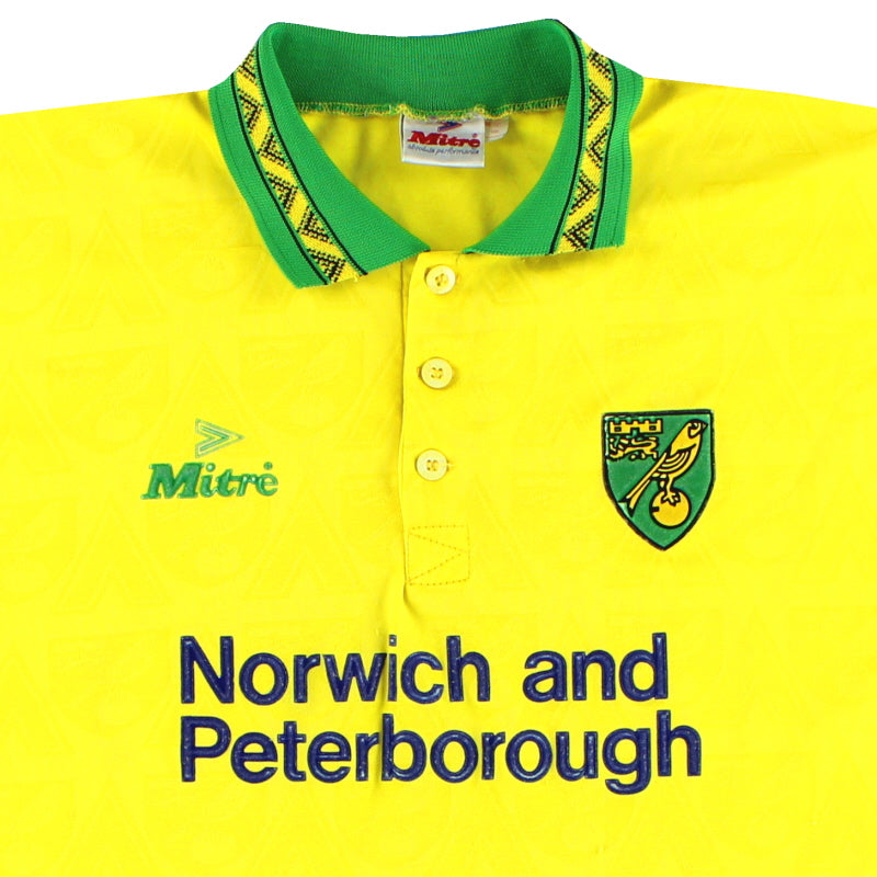 Home shirt as worn when Norwich City were relegated from the Premier League after finishing 20th in the league. Norwich City could not gain promotion straight back to the Premier League in the next season after they finished 16th in the First Division.