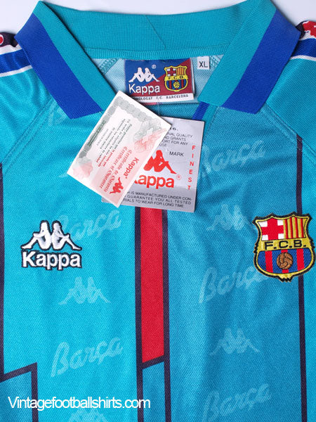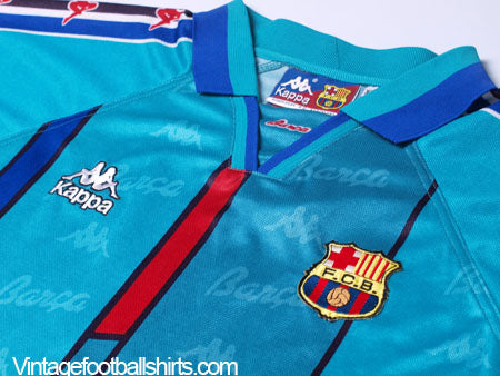 Details - Away shirt as worn when Barcelona finished 3rd and 2nd respectively in La Liga and made it to back to back Copa del Rey finals, losing 1-0 after extra time against Atletico Madrid in the 1995-96 season before beating Real Betis 3-2 after extra time in the 1996-97 season. Also worn when Barcelona won the 1996-97 UEFA Cup Winners' Cup, losing 1-0 against Paris Saint-Germain.