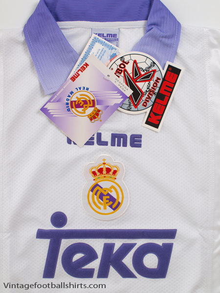 Details - Home shirt as worn when Real Madrid finished 4th in La Liga and were knocked out in the last 16 of the Copa del Rey, being knocked out on away goals against Deportivo Alaves after the tie finished 2-2 on aggregate. Also worn when Real Madrid won the Champions League, beating Juventus 1-0 in the final with Predrag Mijatovic scoring the only goal of the game.