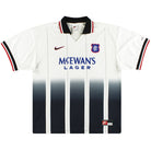 Details - Away shirt as worn when Rangers finished runners up in both the Scottish Premier League and Scottish Cup in the 1997-98 season before winning a domestic treble in the next season. Also worn when Rangers were knocked out in the third round of the 1998-99 UEFA Cup, losing 4-2 on aggregate against Parma.