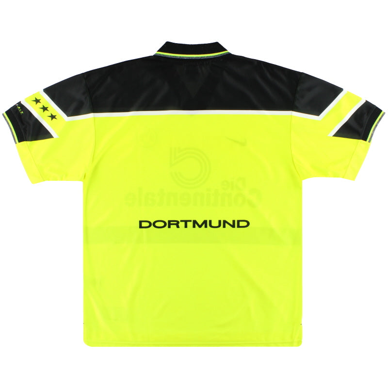 Details - Home shirt as worn when Borussia Dortmund won the 1997 Champions League final, beating Juventus 3-1, before the shirt sponsor was changed to S.Oliver for the start of the 1997-98 season.