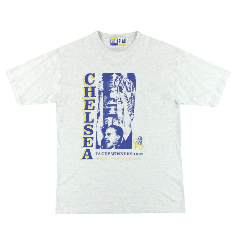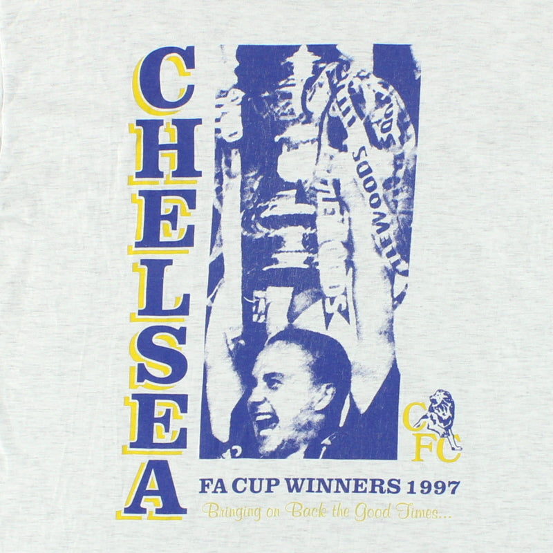 Graphic tee released when Chelsea finished 6th in the Premier League and also won the 1997 FA Cup final under Ruud Gullit, beating Middlesbrough 2-0 with goals from Roberto Di Matteo and Eddie Newton.
