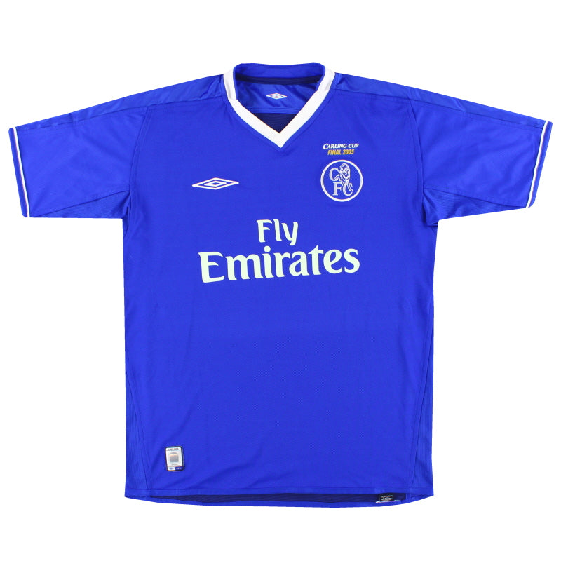 Home shirt as worn when Chelsea were competing in the 2005 Carling Cup Final on February 27, 2005, at the Millennium Stadium in Cardiff. Chelsea held on to win 3-2, securing their first trophy under José Mourinho.