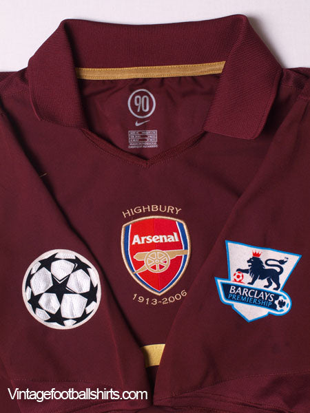Details - Redcurrant home shirt released to mark Arsenals last season at Highbury, features 'HIGHBURY 1913-2006' embroidered around club crest, and also to rear of shirt. During the season Arsenal finished 4th in the Premier League and made it to the 2006 Champions League final where they lost 2-1 against Barcelona with Sol Campbell giving Arsenal the lead in the first half, despite Jens Lehmann being sent off in the 18th minute, before 2 goals in the last 15 minutes from Samuel Eto'o and Juliano Belletti meant that Barcelona would lift the trophy.