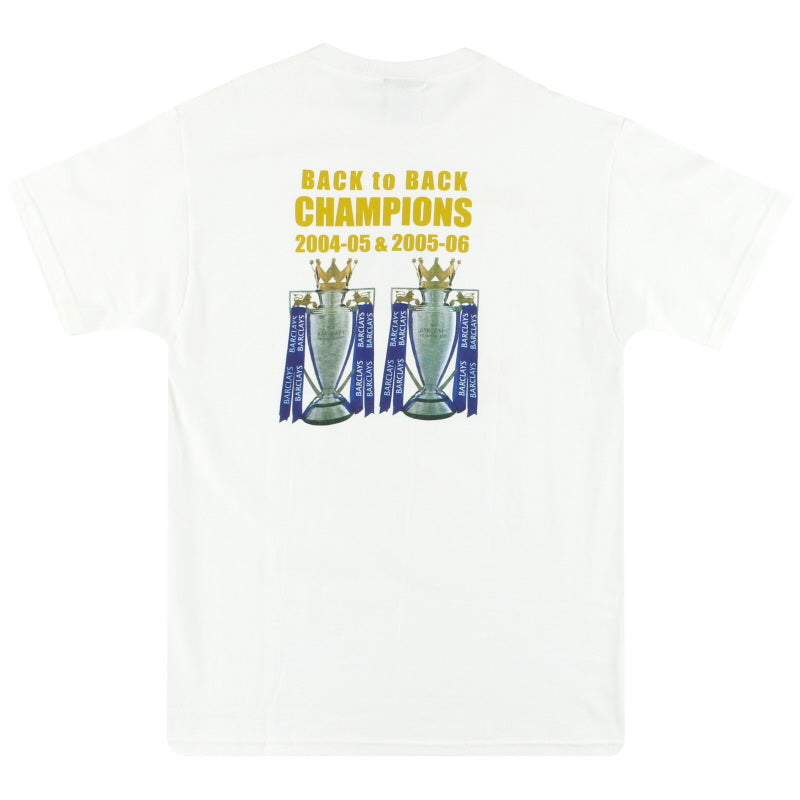 Details - Champions T-shirt to celebrate back to back wins of the Premier League title 04/05 . However they failed to retain their League Cup title after being knocked out in the third round, losing 5-4 on penalties against Charlton Athletic. Also worn when Chelsea were knocked out in the last 16 of the Champions League, losing 3-2 on aggregate against Barcelona.