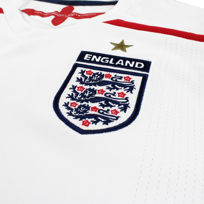 Home shirt as worn when England failed to qualify for the 2008 European Championship after finishing 3rd in their qualification group behind Croatia and Russia, missing the chance to compete in Austria and Switzerland after losing their final qualification game 3-2 against Croatia meaning they would finish 1 point away from qualification to the tournament and would lose manager Steve McClaren his job.