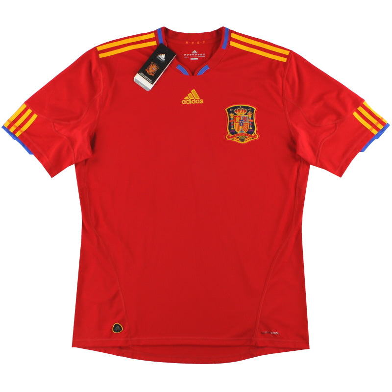 Details - Home shirt as worn when Spain competed in the 2010 World Cup with the team topping their group with 6 points, level on points with Chile, and went on to make it to the final of the competition where they faced the Netherlands with Andres Iniesta scoring the winning goal for Spain in extra time, winning the country their first ever World Cup.
