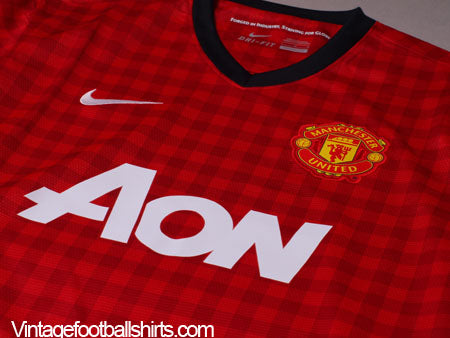 Details - Home shirt as worn in Sir Alex Ferguson's final season in charge of Manchester United before retirement. Manchester United won the Premier League title for the 20th time after a Robin van Persie hat trick against Aston Villa clinched it with 4 games still to play