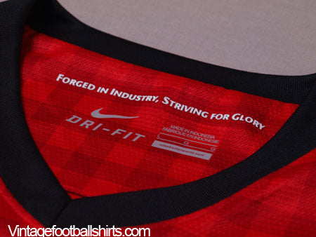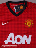 Details - Home shirt as worn in Sir Alex Ferguson's final season in charge of Manchester United before retirement. Manchester United won the Premier League title for the 20th time after a Robin van Persie hat trick against Aston Villa clinched it with 4 games still to play