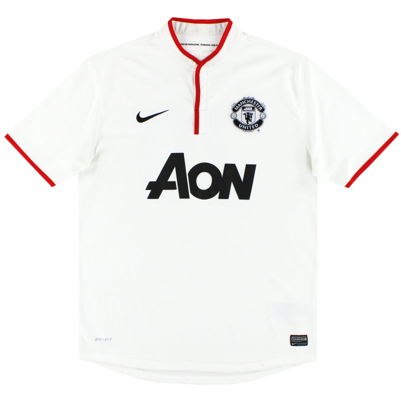 Details - Away shirt as worn in Sir Alex Ferguson's final season in charge of Manchester United before retirement. Manchester United won the Premier League title for the 20th time after a Robin van Persie hat trick against Aston Villa clinched it with 4 games still to play. Then it was used as a third shirt the next season when David Moyes took charge of Manchester United but failed to impress and was eventually sacked and replaced by interim manager Ryan Giggs.