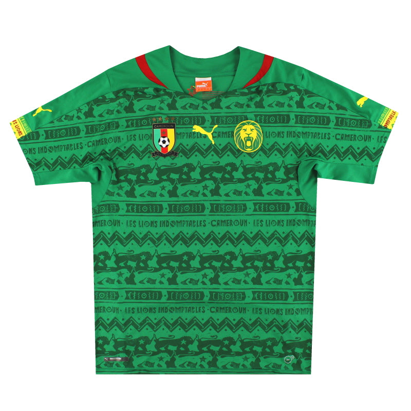 Home shirt as worn when Cameroon were competing in the 2014 World Cup, being knocked out in the group stage of the competition after finishing bottom of their group behind Brazil, Mexico and Croatia.