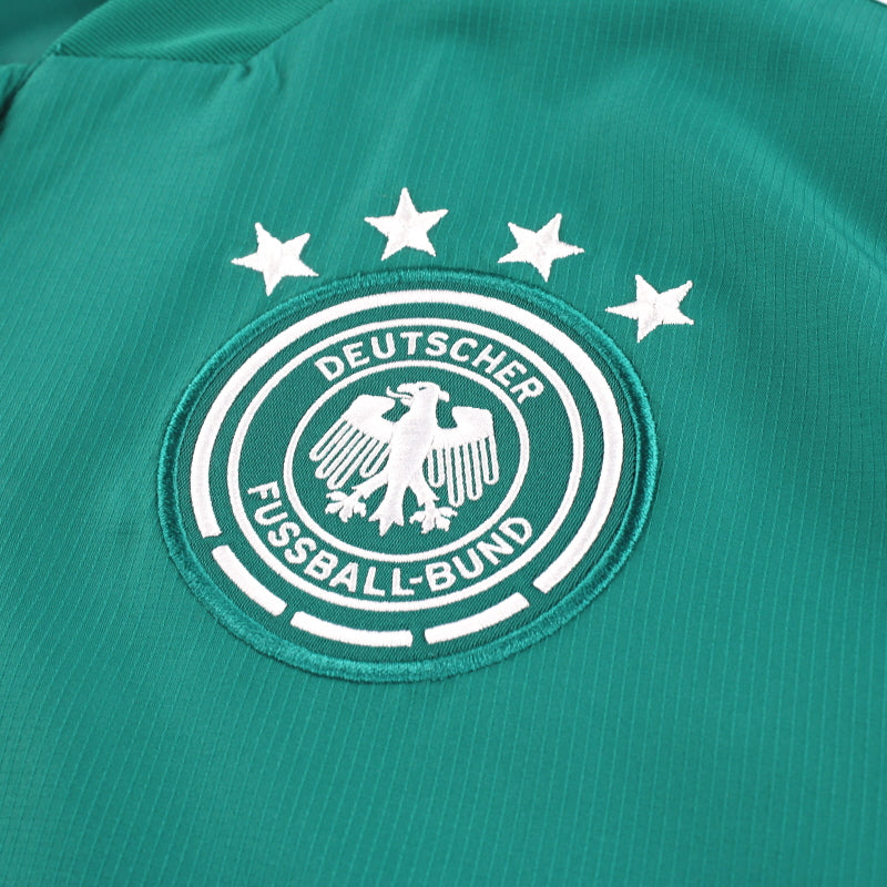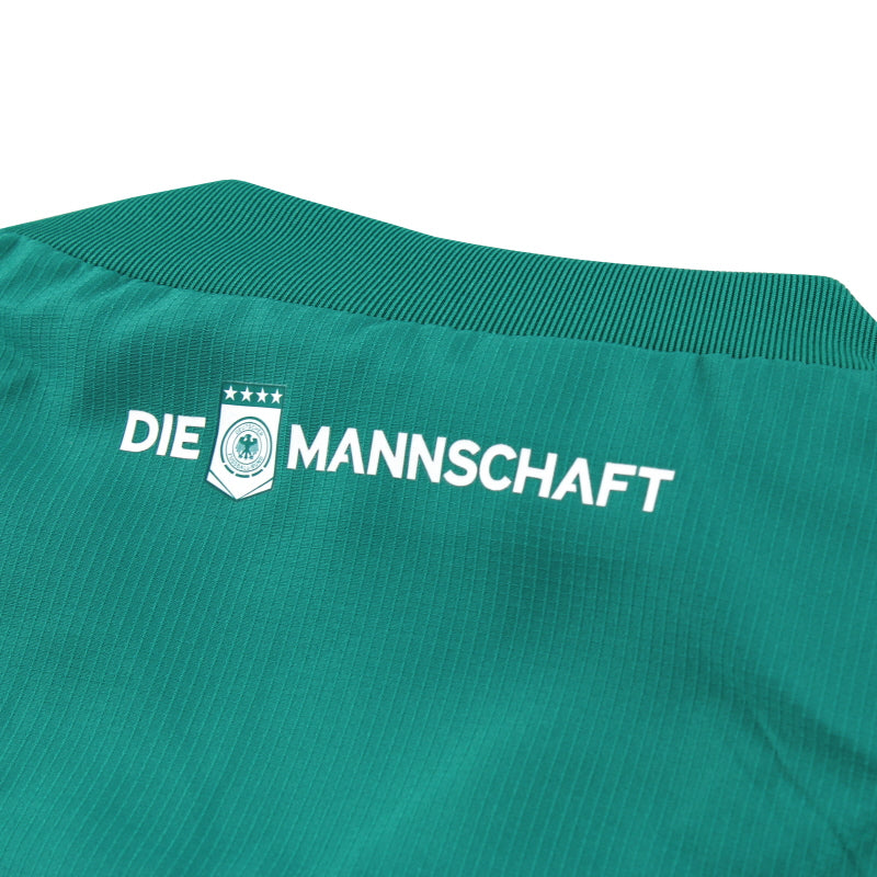 Details - Presentation jacket used when Germany competed in the 2018 World Cup, attempting to defend the title they won 4 years earlier, being knocked out in the group stages after losses against Mexico and South Korea meant they finished bottom of their group. The design for the shirt is insipred by the kit West Germany wore when they won their 3rd World Cup at Italia 1990.