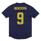 Features - Benzema #9 to reverse in official plastic print, transfer material badges and sleeve stripes, black adidas Authentic patch to lower front