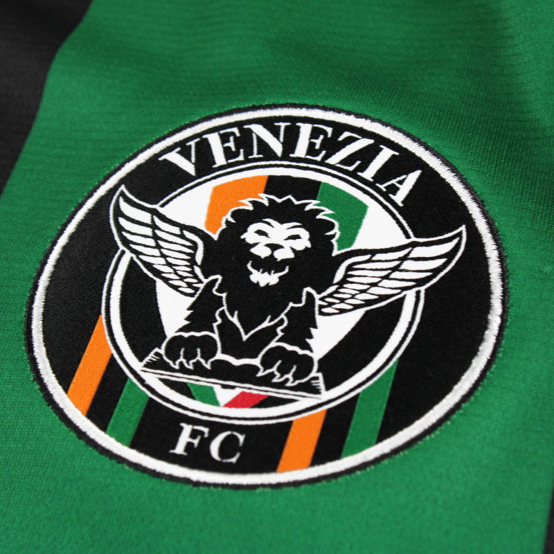Home shirt which features a return to the club's traditional stripes with an equally sized orange and green stripe to the front, as worn when Venezia were attempting to earn promotion to Serie A. During the season Venezia finished in 11th place.