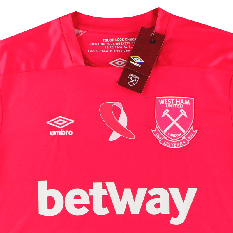 Special edition Warm up shirt as worn by West Ham Women's team during the month of October to show support and awareness for Breast Cancer. Boasts a bright design in pink and white. The reverse features a graphic pattern of the charity and the Hammers motif.