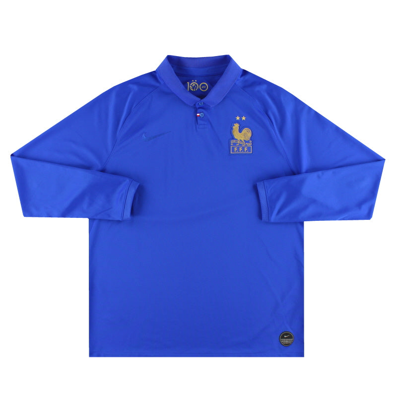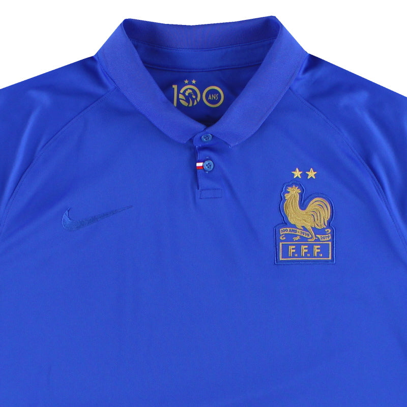 The 2019 France Nike Centenary Home Shirt was released to commemorate the 100th anniversary of the French Football Federation. Designed with a clean and elegant look, the shirt features a crisp white base, paying homage to France’s traditional colors while setting it apart from the usual blue. A subtle tricolor detail runs down the sides, symbolizing the French flag, and the FFF crest is embroidered in gold to highlight the centenary celebration. Inside the collar, a special "100 Ans" (100 Years) inscription marks the milestone