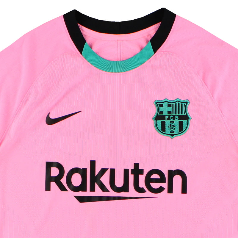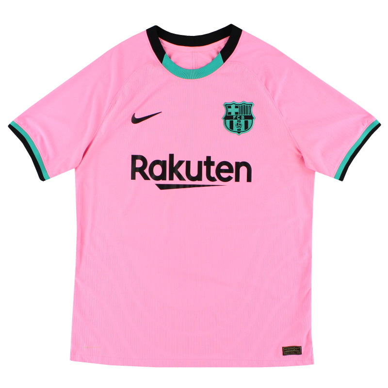 Pink third shirt as worn when Barcelona finished 3rd in La Liga under Ronald Koeman as they finished 7 points behind Champions Atletico Madrid with this being Barca's lowest finish in La Liga since the 2007-08 season. This was also Lionel Messi's last season at the club as he helped the team to a record extending 31st Copa del Rey title before leaving at the end of the season to join Paris Saint-Germain.