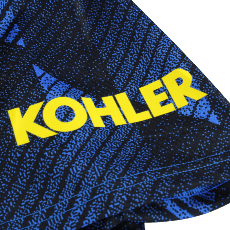 The third kit seems to draw inspiration from the away kit worn between 1993 and 1995. The shirt is blue with a discreet all-over black pattern, incorporating subtle 'M's in a retro-inspired design.