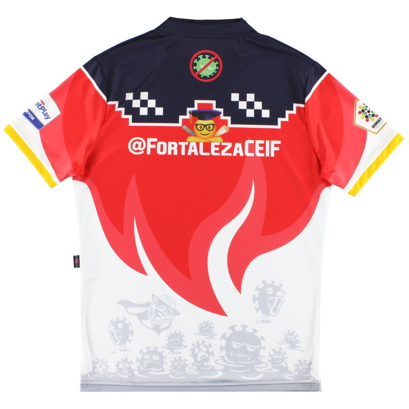 Home shirt as worn when Fortaleza finished 7th in the Torneo BetPlay Dimagor season. The new shirt presents a design that is generally based on the club's crest, combined with pixelated lenses and memes in the lower area in reference to Covid-19 pandemic. The club's @ on Twitter has a prominent presence on the back, accompanied by a reference to the club's school, which has an educational focus on its minor divisions.