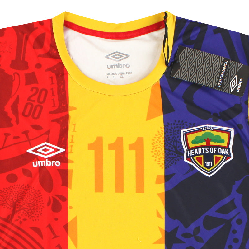 Details - Striking home shirt as worn when Hearts of Oak finished 12th in the Ghanaian Premier League. Subtle graphics appear all over this design, displaying various trophies won by the club and also the number '111' is displayed between the club crest and Umbro's white logo, celebrating the the Phobians' 111th anniversary