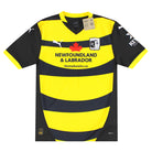This away kit not only provides Barrow AFC with a distinctive presence on the pitch but also symbolizes the club's blend of local heritage and global outreach, encapsulated in a design that balances tradition with modernity. Prominently displayed on the front of the shirt is the logo of Newfoundland and Labrador, serving as the main sponsor and highlighting the club's international connections.