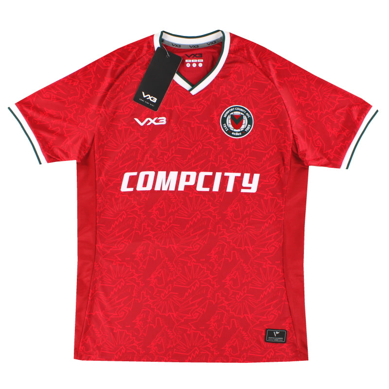 Newport County AFC's 2024-25 Third shirt designed in collaboration with VX3, draws inspiration from the colours of the Welsh flag. This design pays homage to the club's Welsh heritage