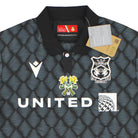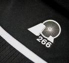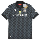 Wrexham AFC’s new all-black away shirt features a knitted polo collar and sleeve edges with a fine white stripe. A sublimated dragon-scale pattern runs across the jersey, reflecting the club’s identity. Inside the back neck, a custom label highlights its design origins with the club crest and “Designed in Bologna” text. The Macron Hero appears in white silicone on the right chest, while the Wrexham AFC crest is applied in white on black fabric on the left. A white print of a wheel over a mine on the outer back neck honours the 266 miners lost in the Gresford Colliery disaster.
