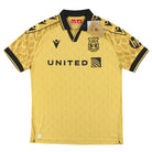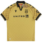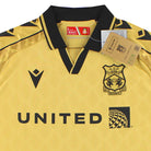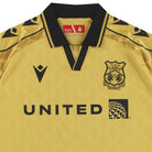 Wrexham AFC is proud to unveil their 2024/25 third kit. The bold gold Macron shirt features a polo collar, relaxed fit, and a scaled dragon pattern on the sleeves. The black Wrexham AFC badge and sponsor logos complete the design. Made from sustainable Eco Fabric, the kit also includes a tribute to the 266 victims of the Gresford Colliery on the nape, marking the 90th anniversary.