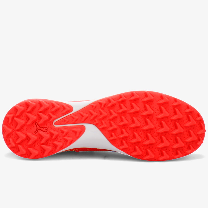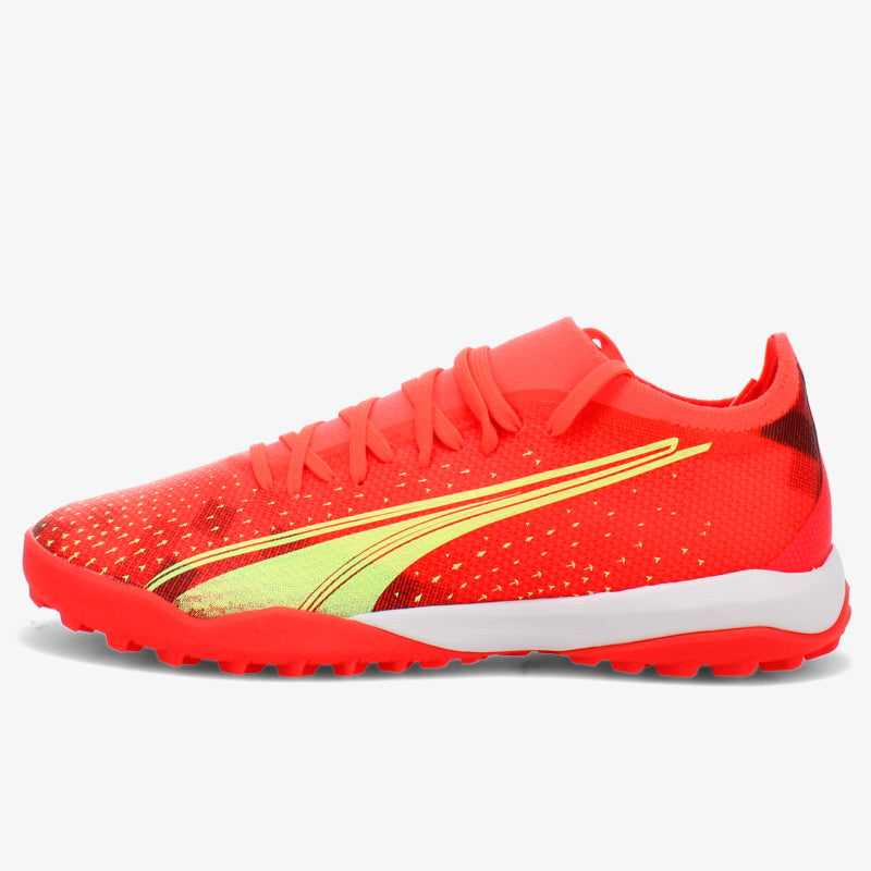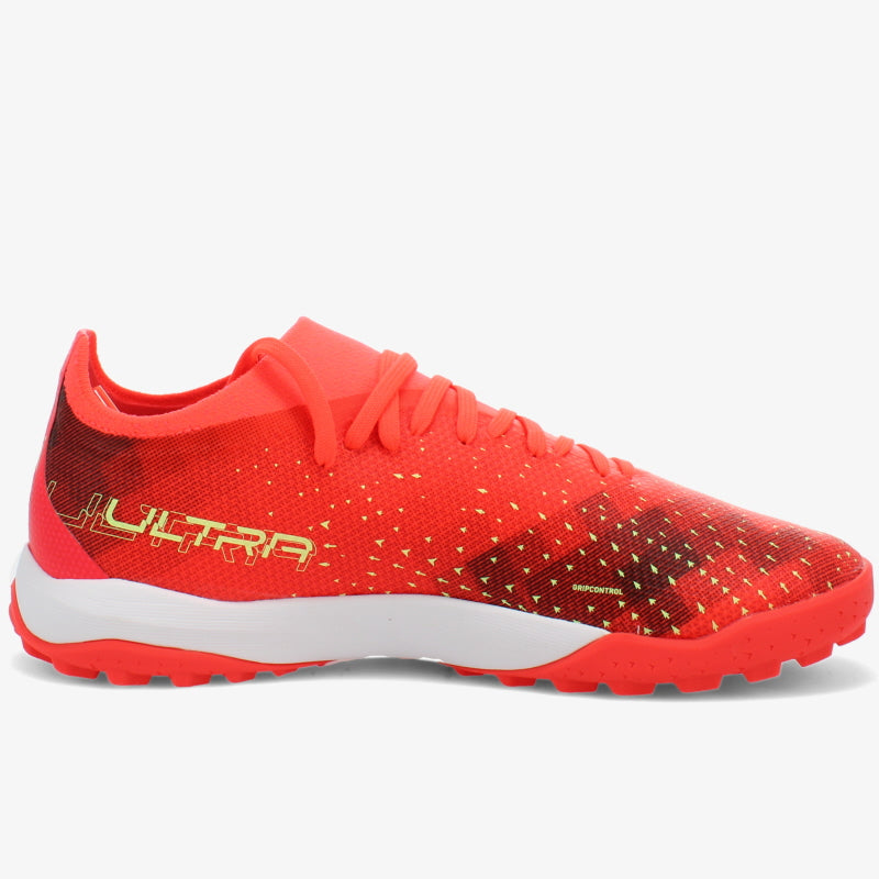 Details - Puma Ultra match is a part of the Puma Ultra line, which is known for its lightweight and agile design, aimed at helping players move quickly and efficiently on the field. The Puma match tt features a lightweight and breathable upper made from a combination of synthetic and mesh materials with a Grip control skin. The upper is designed to provide a snug and comfortable fit, while also allowing for airflow to keep the feet cool and dry during play. The soleplate of the Puma Ultra 4.3 is made from a durable and lightweight TPU material. It features turf soleplate, strategically placed to provide optimal traction and stability on both firm and artificial turf surfaces. One of the key features of the Puma match tt is its ultra-lightweight design and sock like fit, which is achieved through the use of lightweight materials and a minimalist construction. This makes the shoes ideal for players who prioritize speed and agility on the field. In terms of style, the Puma Ultra 4.3 features a sleek and modern design, with bold colorways and Puma branding on the upper and soleplate