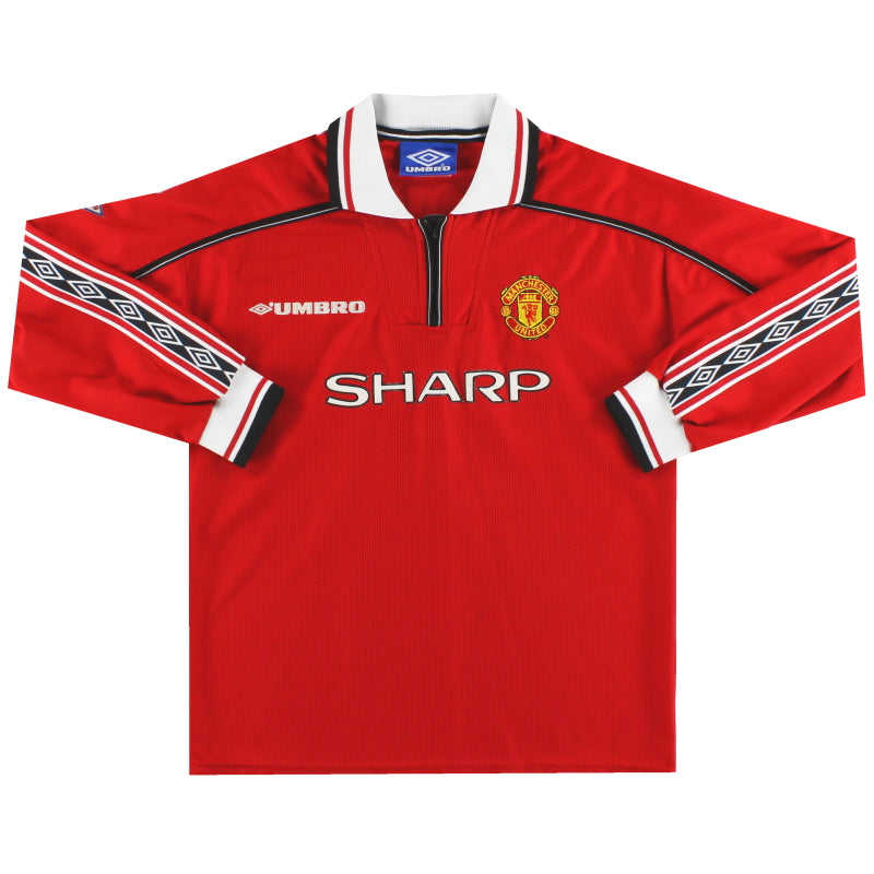 Details - Classic Home shirt as worn when United made history by becoming the first English team to complete the treble. The league title was contested all the way until the final game of the season where only a win would be enough with only a point separating United and Arsenal. A 2-1 win over Spurs saw United crowned Champions of England. The FA Cup saw United face Newcastle at Wembley where The Red Devils showed exactly why they were League Champions with a 2-0 win. Fours days later the treble was complete