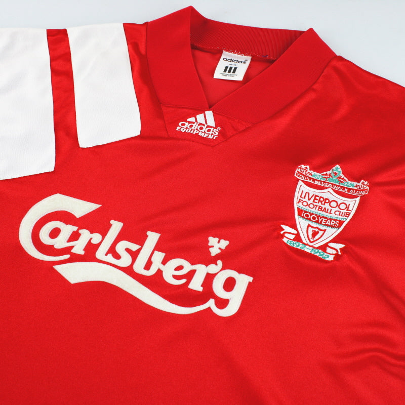 Classic adidas Centenary shirt as worn when the side finished 6th in the Premier League's inaugural season, mainly due to their poor away form, and failed to defend the FA Cup which they won in the previous season, being knocked out in the third round of the competition as they lost 2-0 in a replay against Bolton Wanderers. Also worn when Liverpool were knocked out in the second round of the European Cup Winners' Cup, losing 6-2 on aggregate against Spartak Moscow.