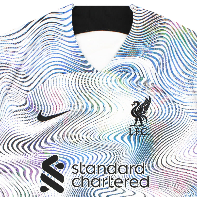 The Nike Liverpool 2022-23 away shirt features a predominantly white base, accented with black for the logos and detailing, the standout feature of Liverpool's 2022-23 away kit is its multi-coloured marble swirl design.
