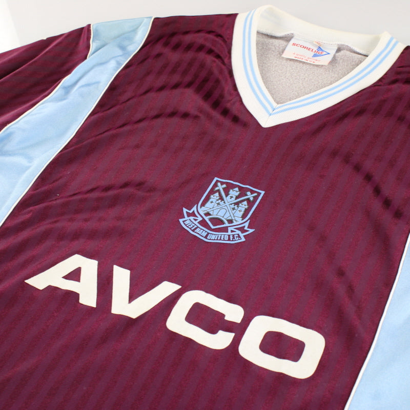 Details - Home shirt as worn when West Ham just avoided relegation from the First Division in the 1987-88 season, finishing in 16th place, before finishing 19th in the next season were relegated to the second tier of English football with manager John Lyall being sacked after 15 years in charge.