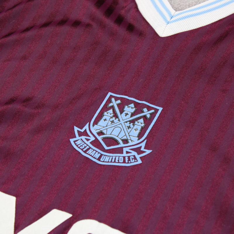 Details - Home shirt as worn when West Ham just avoided relegation from the First Division in the 1987-88 season, finishing in 16th place, before finishing 19th in the next season were relegated to the second tier of English football with manager John Lyall being sacked after 15 years in charge.