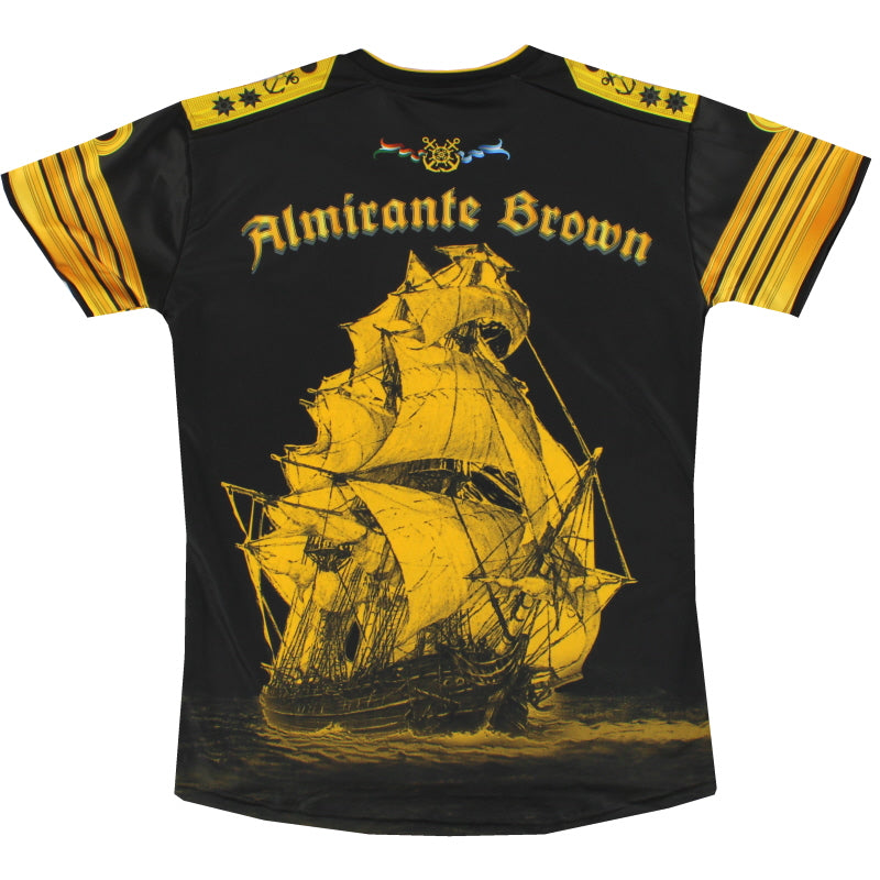 Fourth shirt released by Club Almirante Brown to honour the 164th anniversary of the death of Admiral William 'Guillermo' Brown. The Irish born National hero, who the club is named after, was Argentina's first admiral and is often referrred to as the 'Father of the Argentine Navy'. The shirt features a sketch of William 'Guillermo' Brown on the front and another sketch of a ship on the back. Its colors were taken from an old English locomotive called “Rocket”, famous for winning a competition in the UK organized in 1829 by the Liverpool to Manchester Railway
