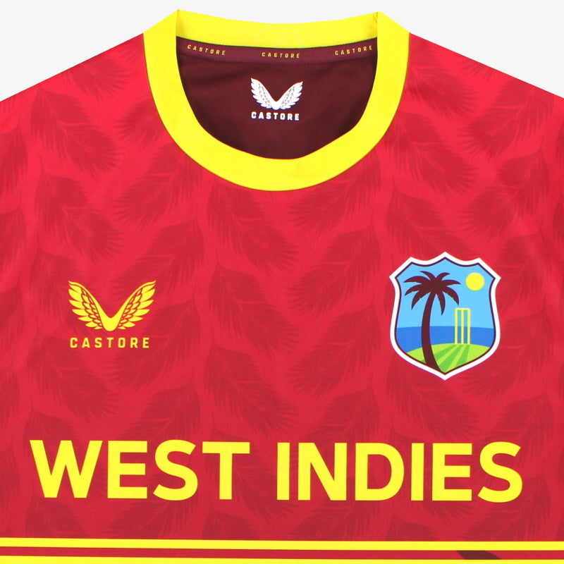 West Indies ODI shirt released for the T20 World Cup, styled with a geometric design and their signature crest. Castore have used their lightweight performance fabric to keep you cool all day long.