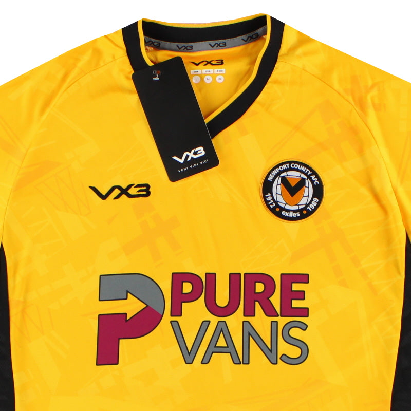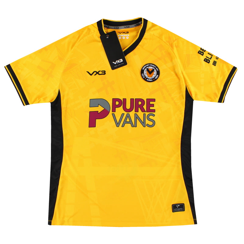 Newport County AFC's 2024-25 Home shirt prominently features the club's traditional amber and black colours and incorporates graphics inspired by the iconic Newport Transporter Bridge, symbolizing the city's rich industrial heritage.