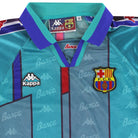 Details - Away shirt as worn when Barcelona finished 3rd and 2nd respectively in La Liga and made it to back to back Copa del Rey finals, losing 1-0 after extra time against Atletico Madrid in the 1995-96 season before beating Real Betis 3-2 after extra time in the 1996-97 season. Also worn when Barcelona won the 1996-97 UEFA Cup Winners' Cup, losing 1-0 against Paris Saint-Germain.